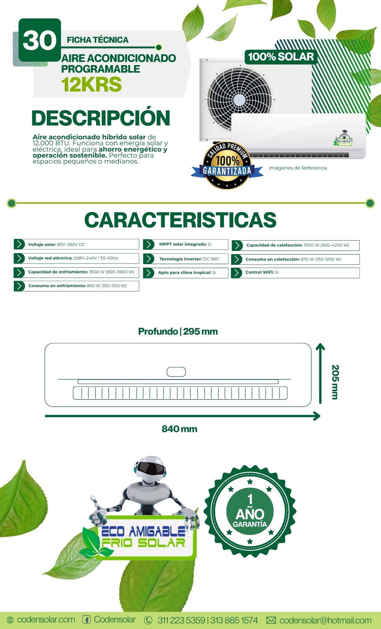 Aire acondicionado híbrido solar de 12.000 BTU, diseñado para funcionar con energía solar (50–380VDC) y red eléctrica convencional, lo que garantiza un alto ahorro energético y sostenibilidad operativa. Gracias a su tecnología inverter DC 180° y su sistema programable, ofrece climatización eficiente tanto en enfriamiento como calefacción. Ideal para espacios pequeños o medianos y apto para climas tropicales. Incluye control WiFi y MPPT solar integrado, siendo una solución inteligente y 100% eco amigable.