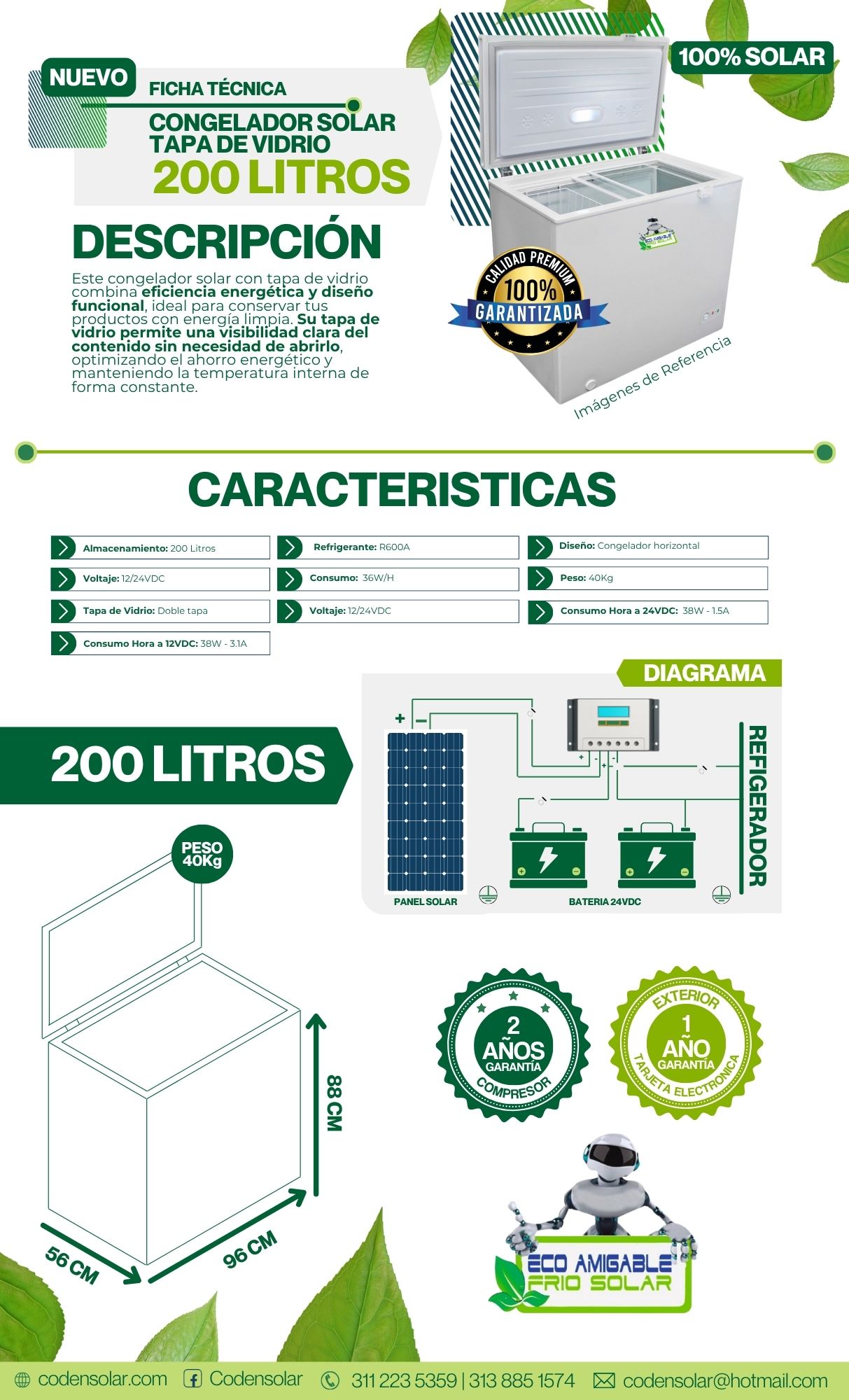 CONGELADOR SOLAR 200 LITROS TAPA DE VIDRIO / 38 WHORA