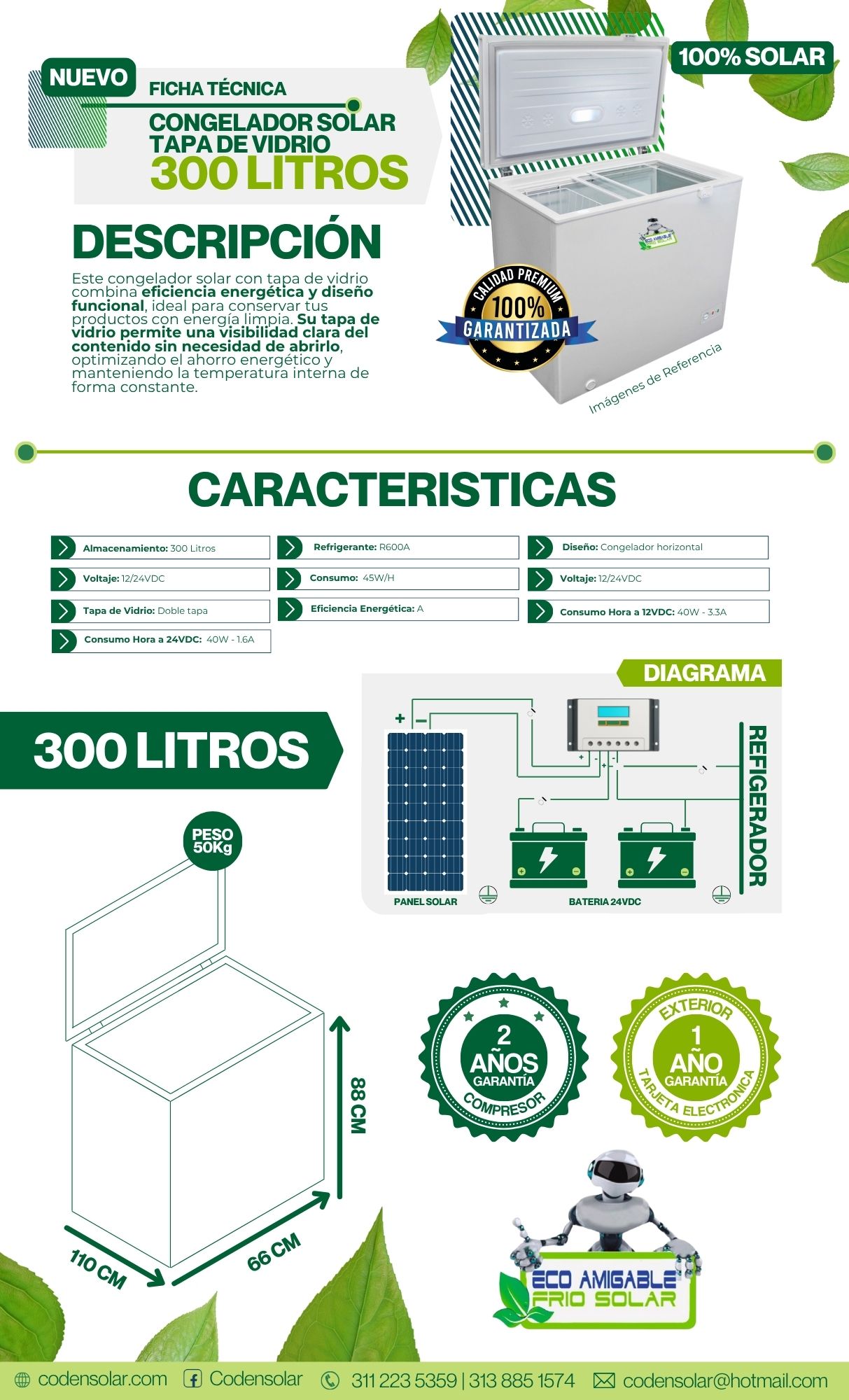 CONGELADOR SOLAR 300 LITROS TAPA DE VIDRIO / 40 WHORA