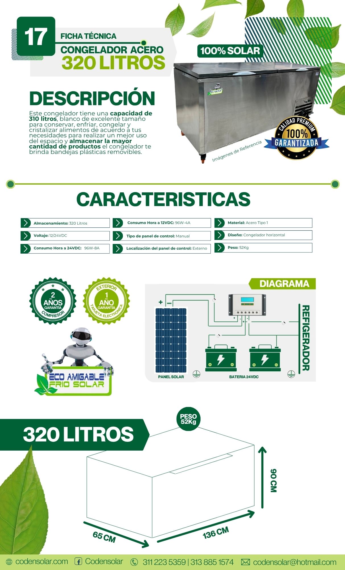 CONGELADOR SOLAR EN ACERO 320LT – 12/24V 320LT ECO AMIGABLE 96WHORA