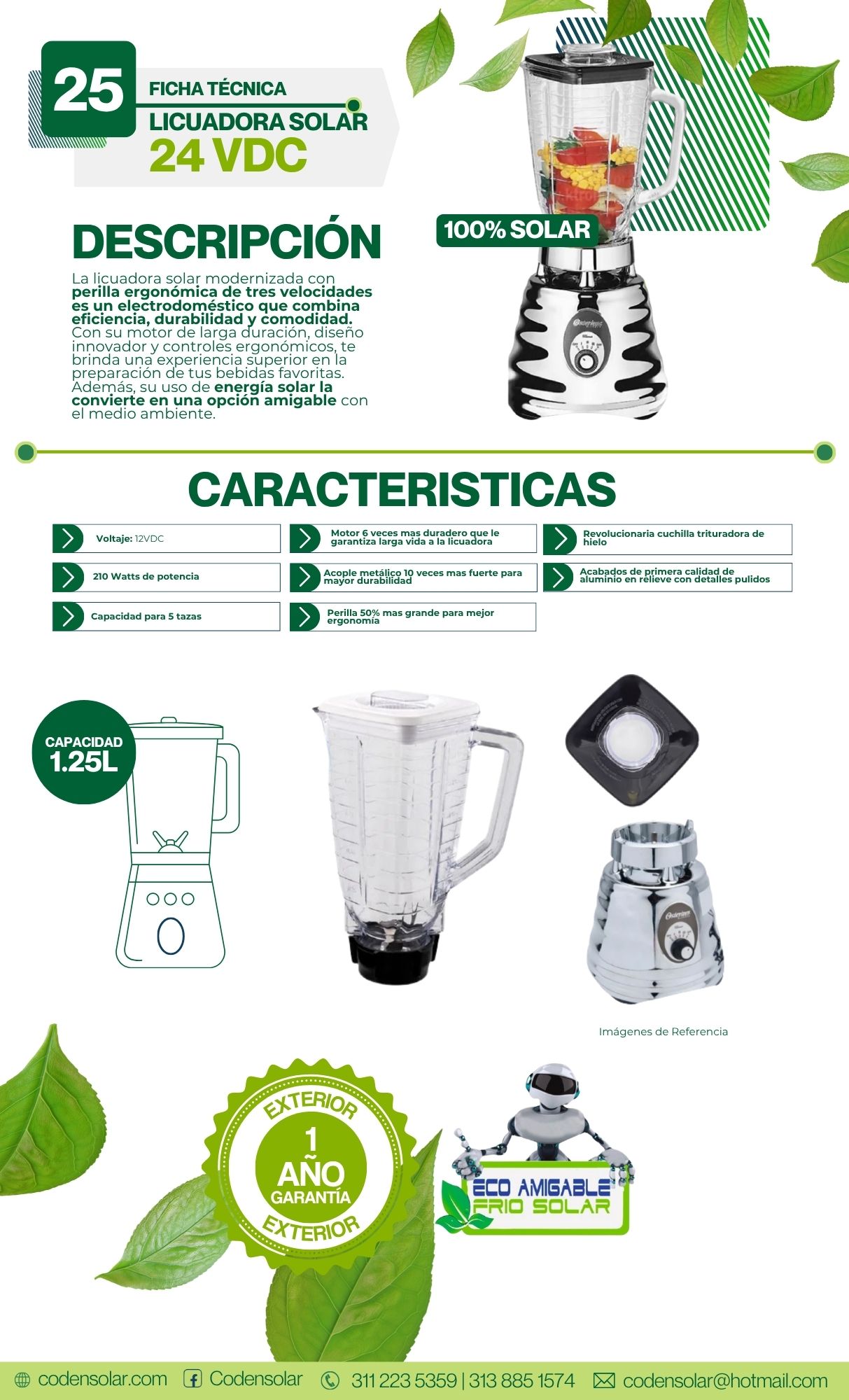 Voltaje: 24VDC, Consumo: 210 W/HD, Motor 6 veces más duradero que garantiza larga vida a la licuadora, Capacidad para 5 tazas, Acople metálico 10 veces más fuerte para mayor durabilidad, Perilla 50% más grande para mejor ergonomía, Acabados de primera calidad de aluminio en relieve con detalles pulidos, Revolucionaria cuchilla trituradora de hielo