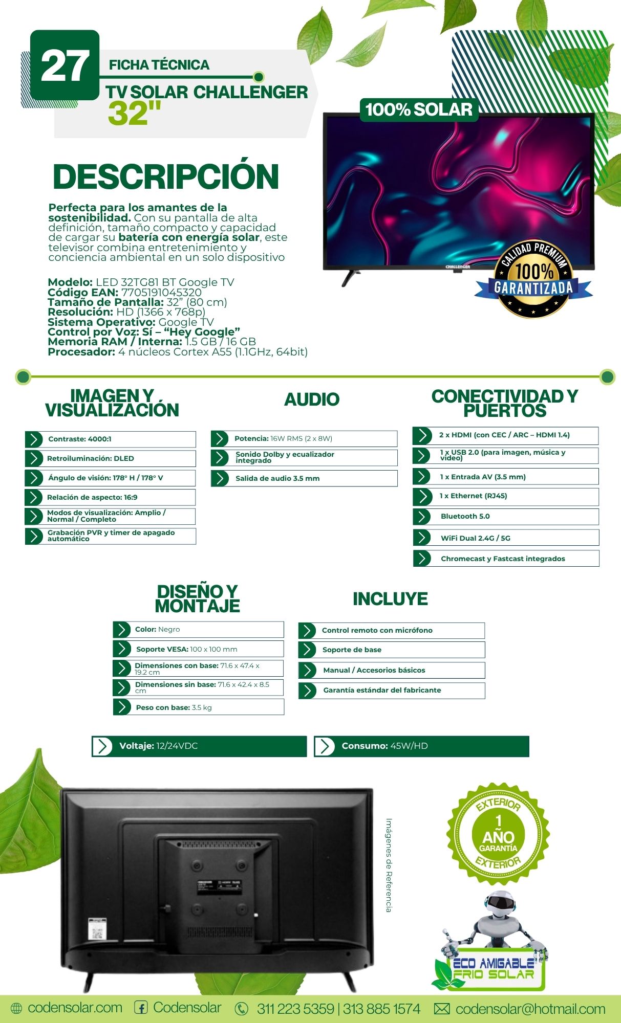 El televisor solar Challenger de 32 pulgadas es la opción ideal para quienes buscan entretenimiento con eficiencia energética. Diseñado para funcionar con sistemas solares (24VDC), combina alta definición, funciones inteligentes y control por voz, sin necesidad de depender de la red eléctrica convencional.