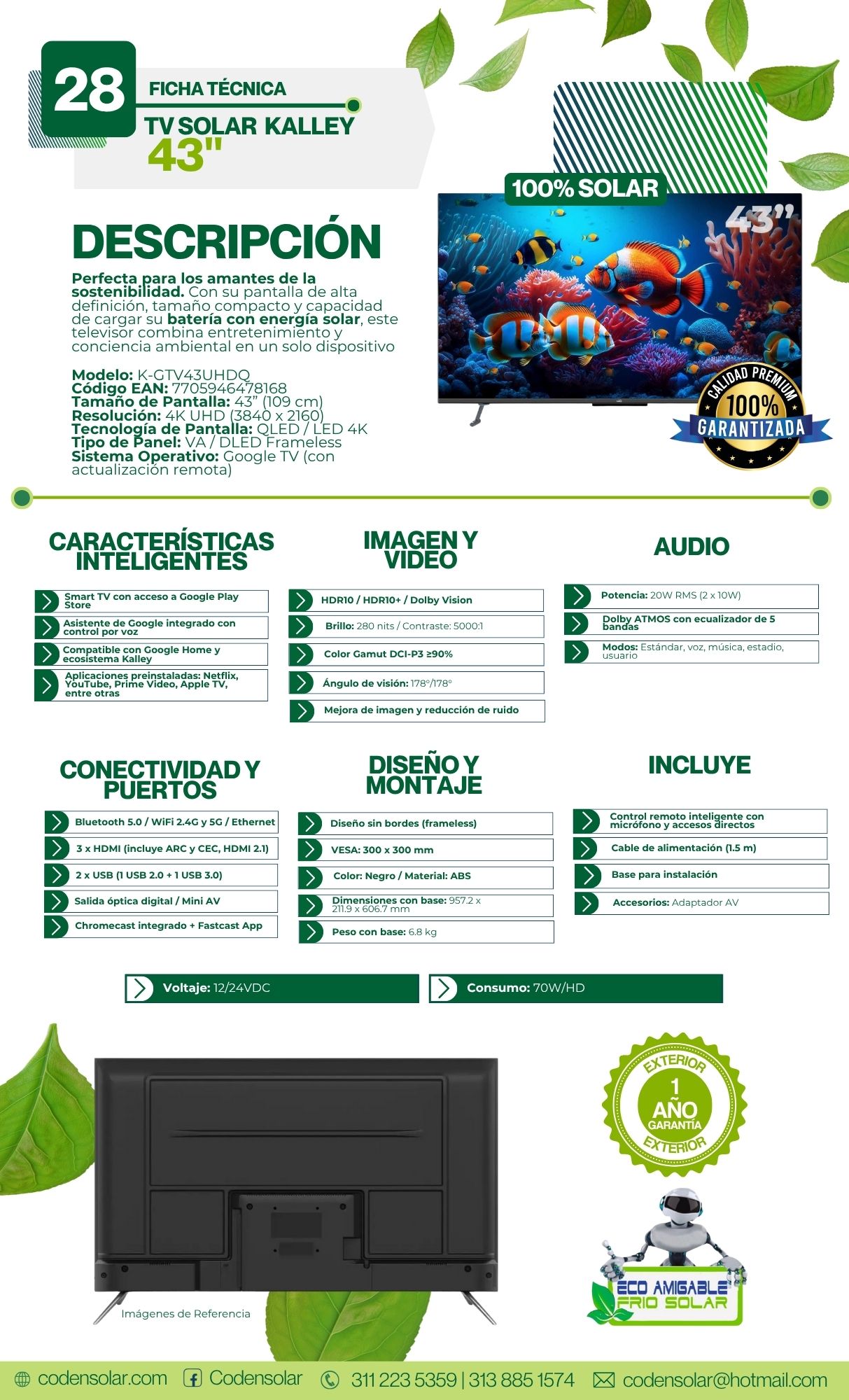 El TV Solar Kalley de 43 pulgadas es la opción ideal para quienes buscan sostenibilidad sin renunciar a la mejor calidad de imagen. Con pantalla 4K UHD (3840 x 2160) y tecnología QLED / LED 4K, este televisor funciona con energía solar (24VDC), permitiéndote disfrutar de tus contenidos favoritos incluso sin conexión a la red eléctrica convencional.